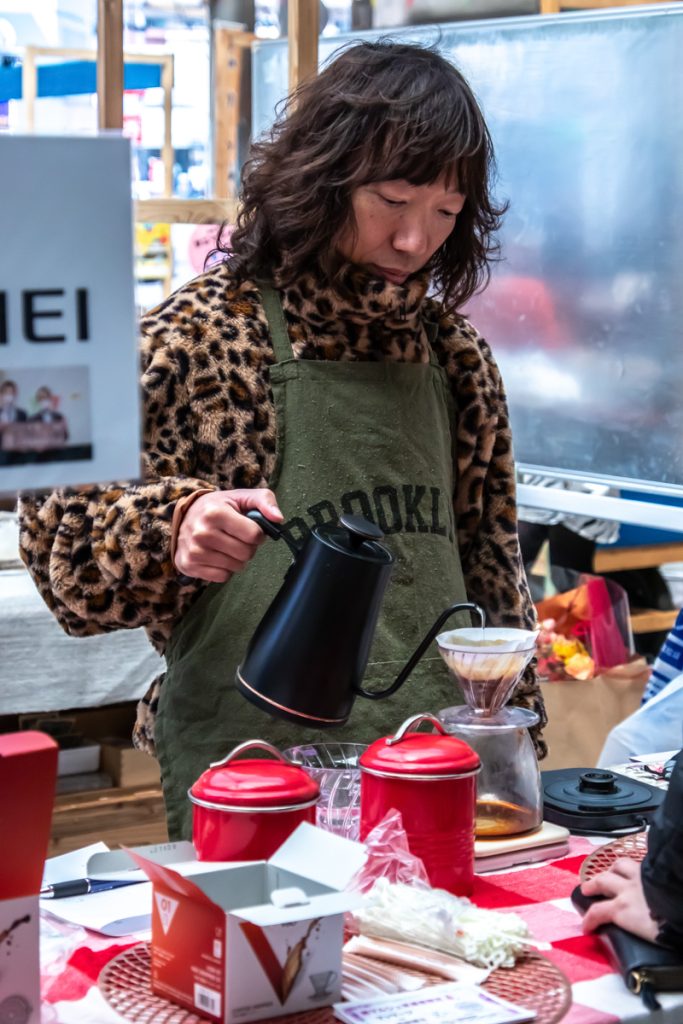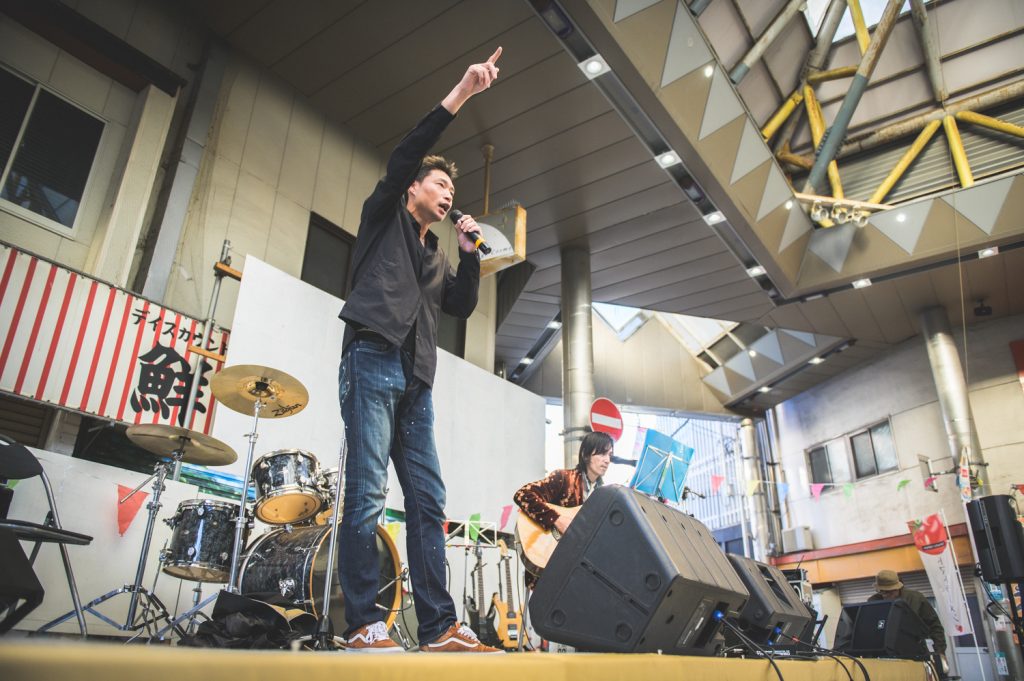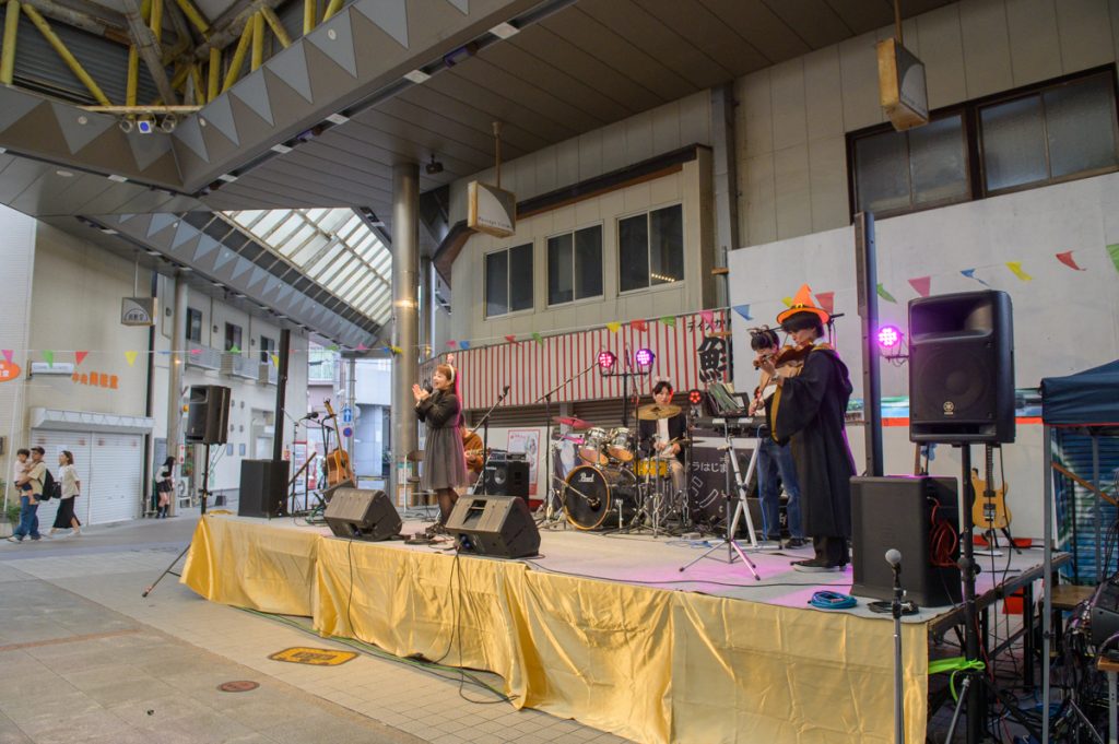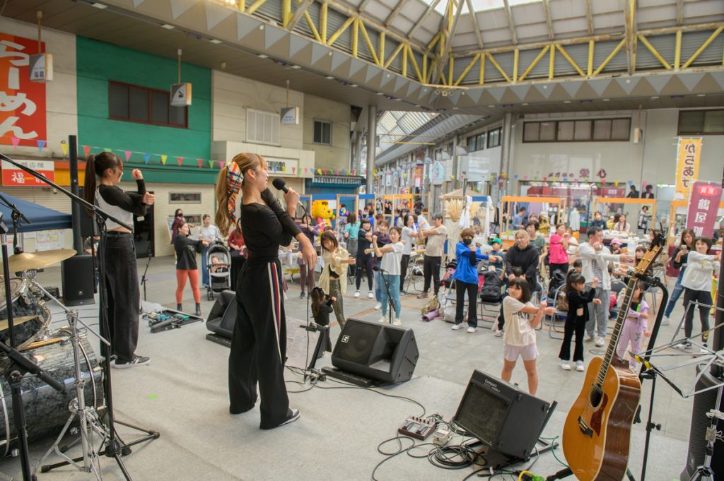 いつもは中央にマルシェ各ブースが並び、奥にステージ、という配置でしたが、今回は実験的に、会場中心部もパフォーマンスステージとしてみました。
